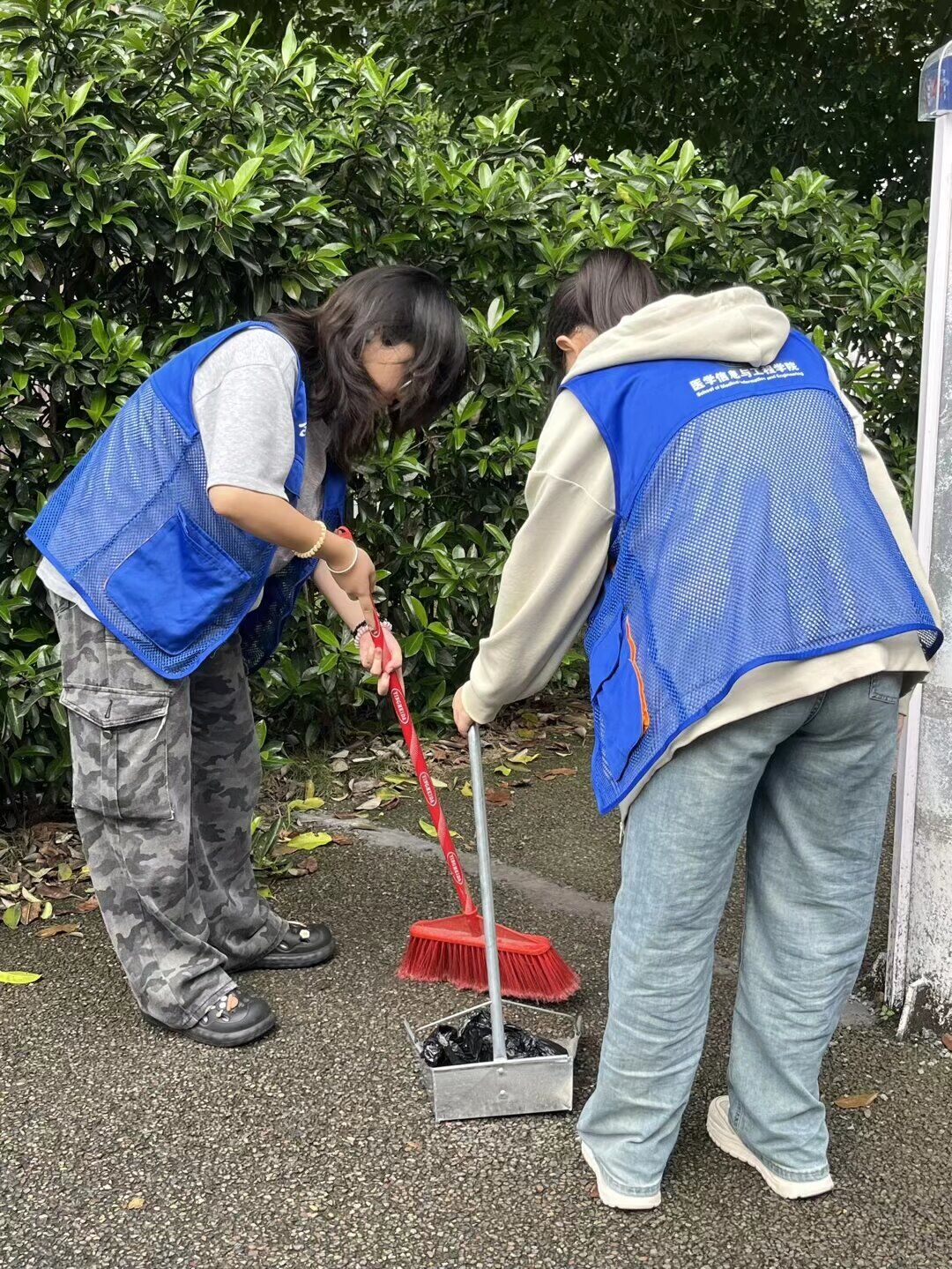 活动过程中,41名志愿者被分为七个小组,在责任区域内干劲十足地打扫起来。同学们挥动着扫帚,仔细清理路面和绿化带中的落叶与杂物,擦拭公共宣传栏和休闲长椅,并将随意停放的单车归置到指定区域有序摆放。大家干劲十足、配合默契,忙碌的身影成为校园里一道亮丽的风景线。打扫结束后,全体志愿者在校内具有建筑特色的活动区开展现场学习打卡,了解建筑历史背景与重要价值,感悟地方人文底蕴。