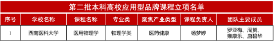 近日,四川省教育厅公布了第二批本科高校应用型品牌课程立项名单。由医学信息与工程学院申报的《医用物理学》课程成功获批立项。