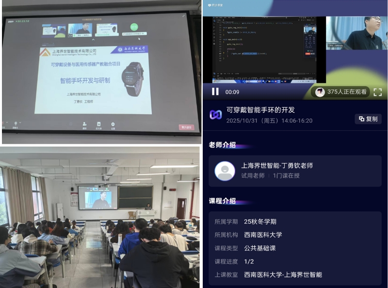 10月31日,西南医科大学医学信息与工程学院联合上海界世智能技术有限公司正式启动“智能手环开发与研制”产教融合校企课堂,依托双方合作科研成果,将科研转化内容引入课堂教学,实现科研与教学深度融合。本次课程面向2023级智能医学工程专业和生物医学工程专业学生开设,采用校企协同授课模式,通过线上线下同步开展教学,线上参与人数近400人。