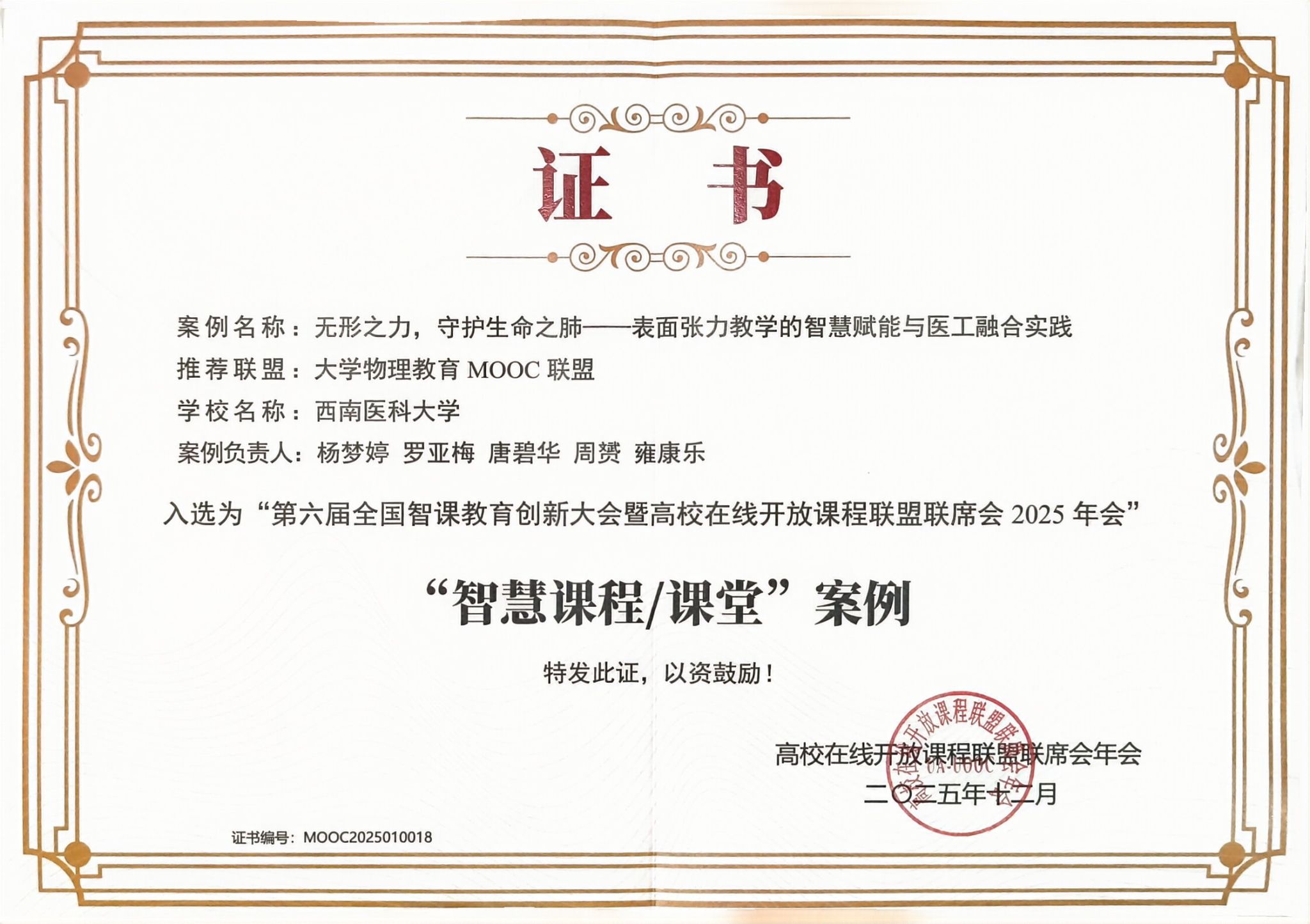 近日,西南医科大学医用物理教学团队(负责人:杨梦婷、罗亚梅、唐碧华、周媛、雍康乐)提交的案例《无形之力,守护生命之肺——表面张力教学的智慧赋能与医工融合实践》,成功入选“第六届全国智课教育创新大会暨高校在线开放课程联盟联席会2025年会”公布的“智慧课程/课堂”优秀案例,并获得荣誉证书。